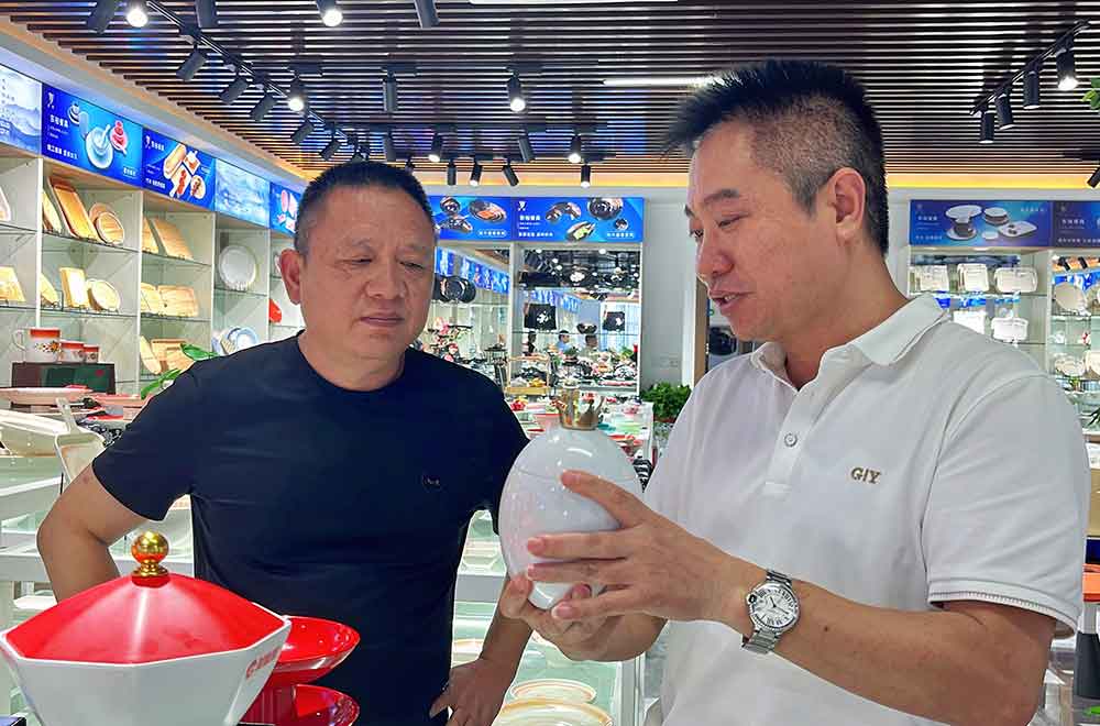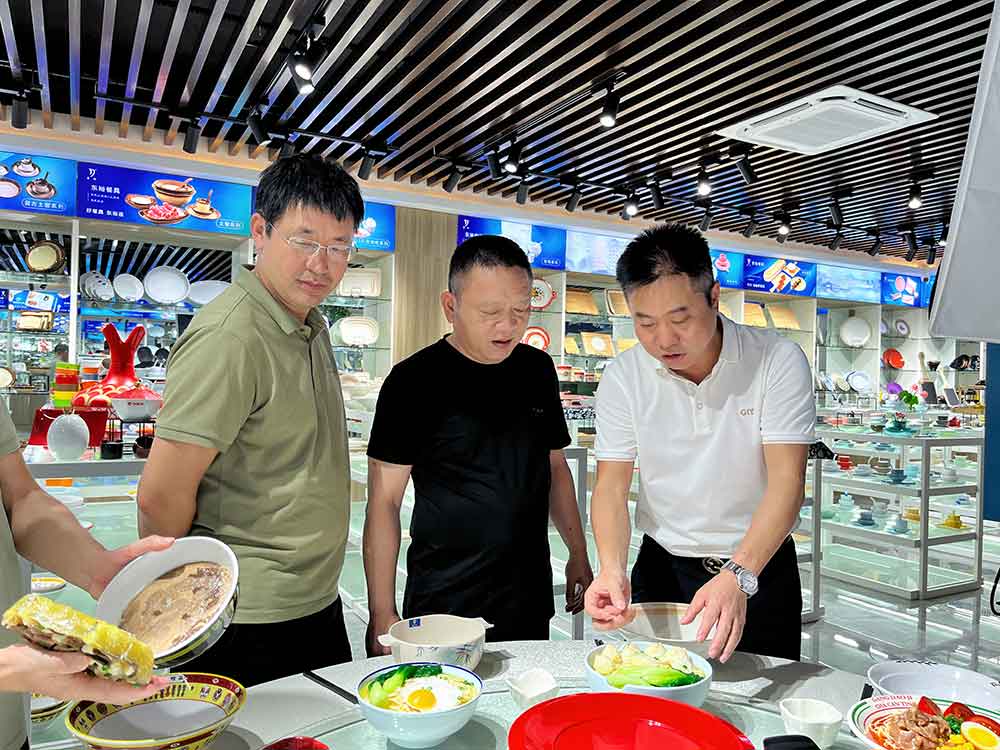 随后东裕谭董带领院长一行,参观我司展厅,院长一行对东裕展厅表示赞赏,对东裕餐具的质感和质量表示很认同。